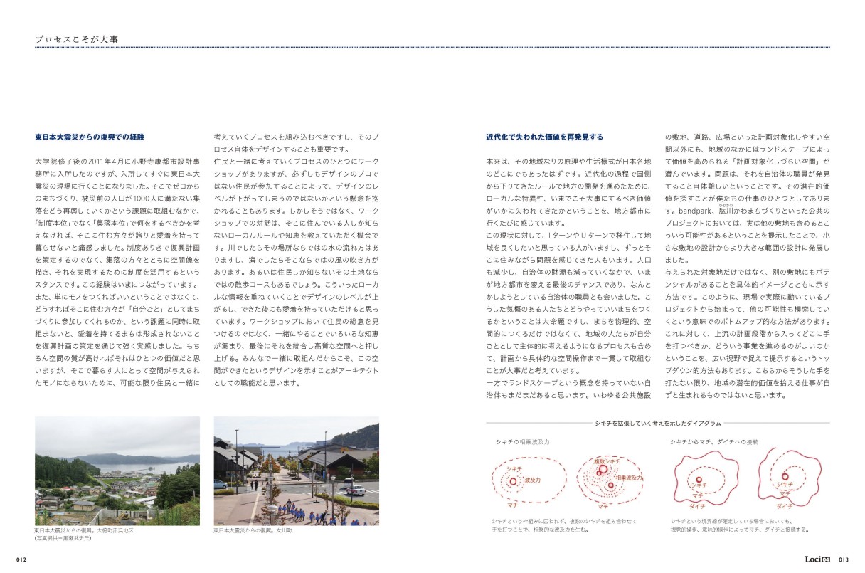 インタビューでは、その出自から計画地への向き合い方、そして設計手法まで赤裸々に語っていただいた。後半では、代表的なプロジェクトの紹介に加え、上條氏が師と仰ぐ都市設計家・小野寺康氏(小野寺康都市設計事務所 代表)のインタビューを掲載することができた。両氏のインタビューからはランドスケープとの親和性を感じつつも都市設計家としての矜持が伝わってきた。上條慎司は、手を入れるべきポイントを探り、見極め、手法を決める。それはあたかも職人がいくつもの道具を使い分けることに似ている。完成形が見えているからこそできる技である。彼も同様に、未来のまちの姿が見えているに違いない。これまで公開してこなかった都市設計家・上條慎司氏のランドスケープへの向き合い方がわかる一冊です。